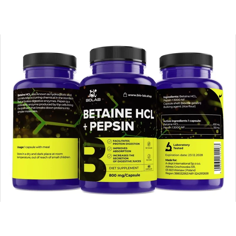 Combinația de Betaina HCL și Pepsina este un sprijin pentru persoanele care se luptă cu probleme digestive, în special cele care, din diverse motive, secretă prea puțin acid clorhidric în stomac. Acidul clorhidric este important pentru absorbția corectă a nutrienților și digestia proteinelor. Deficiența sa poate favoriza problemele digestive și, în consecință, absorbția afectată. Produsul este deosebit de util pentru persoanele care urmează diete bogate în proteine și care doresc să maximizeze absorbția proteinelor și să sprijine dezvoltarea masei musculare.